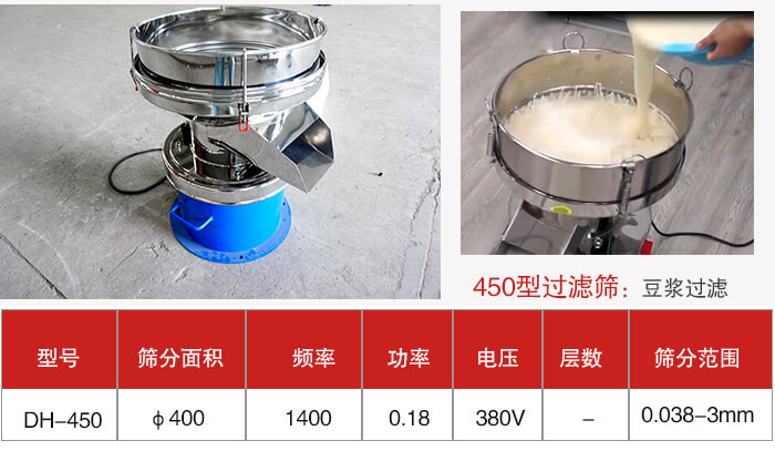 1、450過濾篩:時產(chǎn)量300公斤-500公斤/h,篩分粒度0.038-5,外形尺寸360×300×470mm。