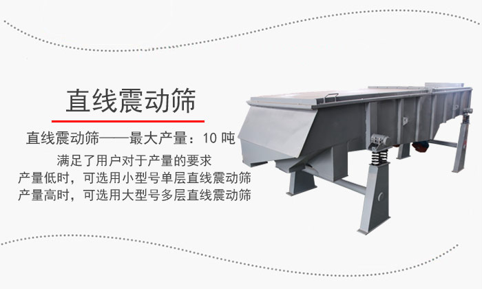 直線振動(dòng)篩的多種型號選擇滿足了用戶對于產(chǎn)量的要求,產(chǎn)量低時(shí),可選用小型號單層直線振動(dòng)篩;產(chǎn)量高時(shí),可選用大型號多層直線振動(dòng)篩,其中直線振動(dòng)篩可滿足時(shí)篩10噸左右!