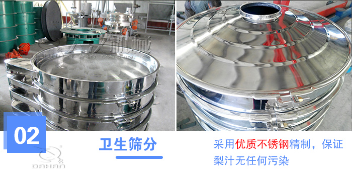 不銹鋼振動(dòng)篩的篩分精度非常高,細(xì)可達(dá)0.028mm(500目),適用于各種液體和超微細(xì)粉末的篩分,可以保證梨汁的精準(zhǔn)篩分、過濾、除雜,同時(shí)篩網(wǎng)可以安裝1-5層,篩分出六種不同粒度規(guī)格的的梨汁,保證了梨汁的口感,能夠適用于客戶不同的需求,功能非常強(qiáng)大。