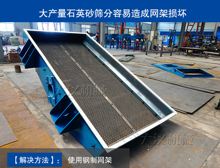 使用石英砂礦用振動篩來進行篩分時,篩分的石英砂都會有一定的的重量,使用普通網(wǎng)架容易造成破損的問題,所以需要使用鋼質(zhì)網(wǎng)架來代替木質(zhì)網(wǎng)架,增加網(wǎng)架和篩網(wǎng)的承受能力,更換為鋼制網(wǎng)架的石英砂礦用振動篩不僅換網(wǎng)比較方便,更可以延長篩網(wǎng)、篩機的使用壽命,鋼質(zhì)網(wǎng)架使用壽命比木質(zhì)網(wǎng)架長。