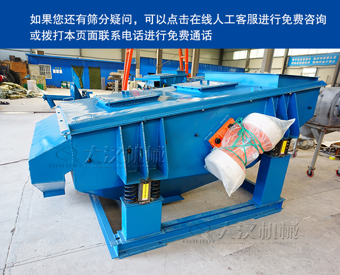 以上就是石英砂礦用振動篩進行篩分工作時要注意的問題,如果您還有篩分疑問,可以點擊在線人工客服進行免費咨詢或撥打本頁面聯(lián)系電話進行免費通話。買機石英砂礦用振動篩,就選<大漢機械>!