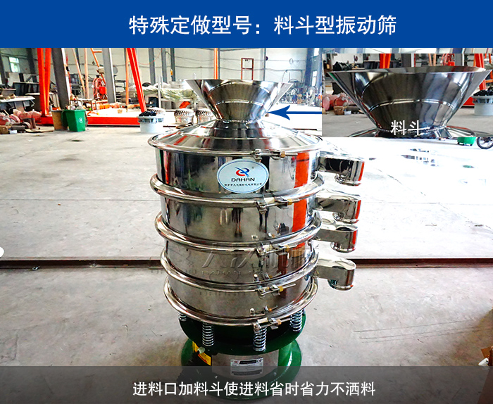 進(jìn)料口加料斗型振動(dòng)篩是在普通振動(dòng)篩的進(jìn)料口上蓋上加裝一個(gè)漏斗型的進(jìn)料斗,可以在人工加料時(shí)節(jié)省時(shí)間力氣并且進(jìn)料過程中不會(huì)灑料造成物料的浪費(fèi)。