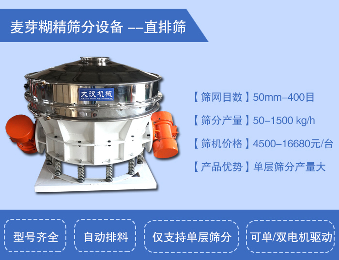 直排篩的型號與旋振篩型號相同,在層數(shù)上僅支持單層篩分,所以主要用于麥芽糊精簡單過濾和除雜,有單電機(jī)和雙電機(jī)兩種驅(qū)動方式(一般選擇雙電機(jī)形式),使麥芽糊精在篩面上產(chǎn)生渦旋運(yùn)動,具有自動排料功能,可24小時連續(xù)自動化生產(chǎn);主要用于粉體生產(chǎn)線工藝流程中的粉體的除雜,篩分作用。