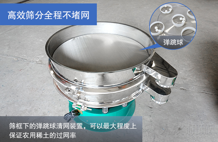 圓形振動(dòng)篩通過(guò)振動(dòng)電機(jī)上兩端的偏心塊將篩機(jī)運(yùn)動(dòng)轉(zhuǎn)化為三元運(yùn)動(dòng)對(duì)農(nóng)用稀土進(jìn)行高效篩分,再加上篩框下的彈跳球清網(wǎng)裝置,可以很大程度上保證農(nóng)用稀土的過(guò)網(wǎng)率,高效篩分全程不堵網(wǎng)。