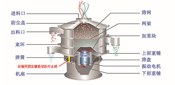 圓形旋振篩主要由振動電機(jī),篩網(wǎng),清網(wǎng)裝置,網(wǎng)架,減震彈簧,底座等部組成。