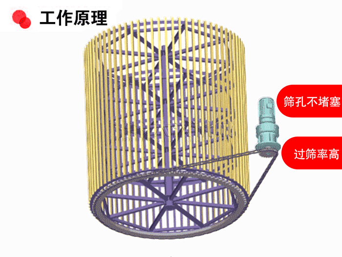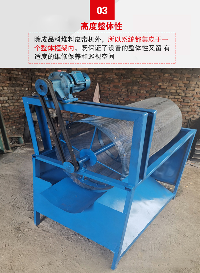 該產(chǎn)品的主要依靠驅(qū)動(dòng)裝置帶動(dòng)滾筒篩網(wǎng),對(duì)于物料做360°旋轉(zhuǎn)時(shí)篩分,在滾動(dòng)篩網(wǎng)的作用下,物料能夠輕松的達(dá)到分散的狀態(tài),從幫助篩網(wǎng)進(jìn)行快速的篩分。通過(guò)篩網(wǎng)網(wǎng)孔的物料留到皮帶輸送機(jī)上,由出料口排出,而沒有通過(guò)篩網(wǎng)篩分的將從肥料口排出,從而完成物料的篩分目的。