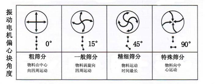 當上下偏心塊調(diào)至45度時,物料呈快速漩渦狀分散,用來篩分精細物料。